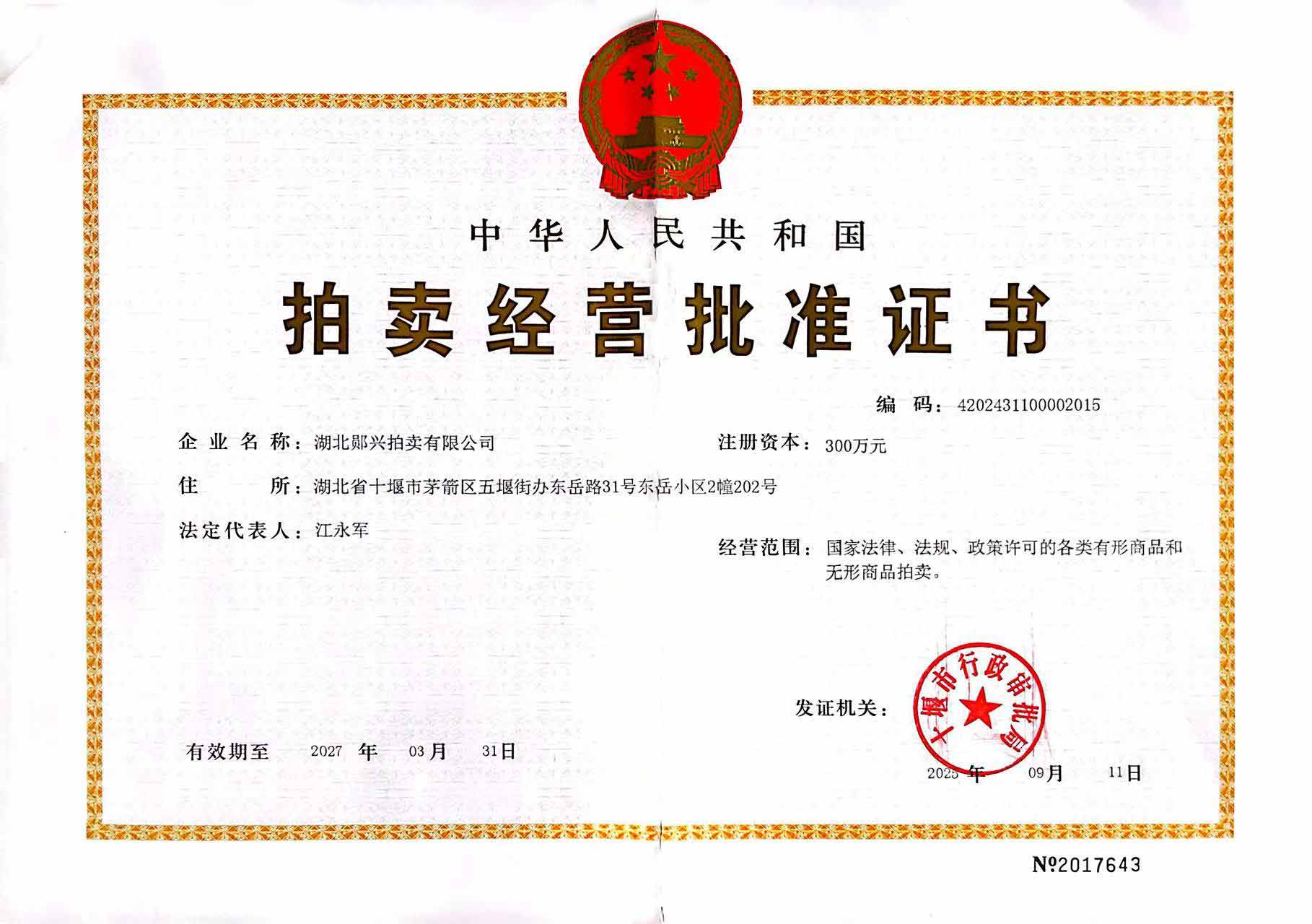 湖北鄖興拍賣(mài)有限公司是經(jīng)湖北省拍賣(mài)業(yè)主管部門(mén)批準(zhǔn),在湖北省工商行政管理部門(mén)注冊(cè),具有法人資格的綜合性一級(jí)拍賣(mài)企業(yè)。 公司于2014年9月12日取得湖北省商務(wù)廳頒發(fā)的拍賣(mài)經(jīng)營(yíng)批準(zhǔn)證書(shū)(證號(hào)4202431100002014),10月22日取得十堰市工商局頒發(fā)的營(yíng)業(yè)執(zhí)照(證號(hào)91420300070769755J),公司注冊(cè)資本300萬(wàn)元,注冊(cè)地址位于十堰市茅箭區(qū)東岳路31號(hào),法人代表江永軍。