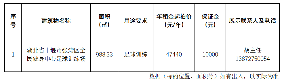湖北鄖興拍賣有限公司于2025年8月28日上午9時(shí)00分在中國拍賣行業(yè)協(xié)會(huì)網(wǎng)絡(luò)拍賣平臺(tái)(網(wǎng)址:https://paimai.caa123.org.cn)公開拍賣位于湖北省十堰市張灣區(qū)全民健身中心足球訓(xùn)練場3年期租賃權(quán):